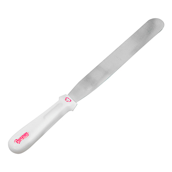 Espátula de acero inoxidable con mango plástico, especial para alisar y rellenar tortas. Permite extender coberturas de ganache o buttercream sobre superficies de tortas altas y grandes. La punta redondeada de la espátula facilita el alisado de la crema o ganache de chocolate. Fabricada en acero inoxidable para un rendimiento suave y de fácil limpieza, también cuenta con un mango de plástico para un agarre cómodo y práctico. Tamaño de superficie de alisado: 20 cm