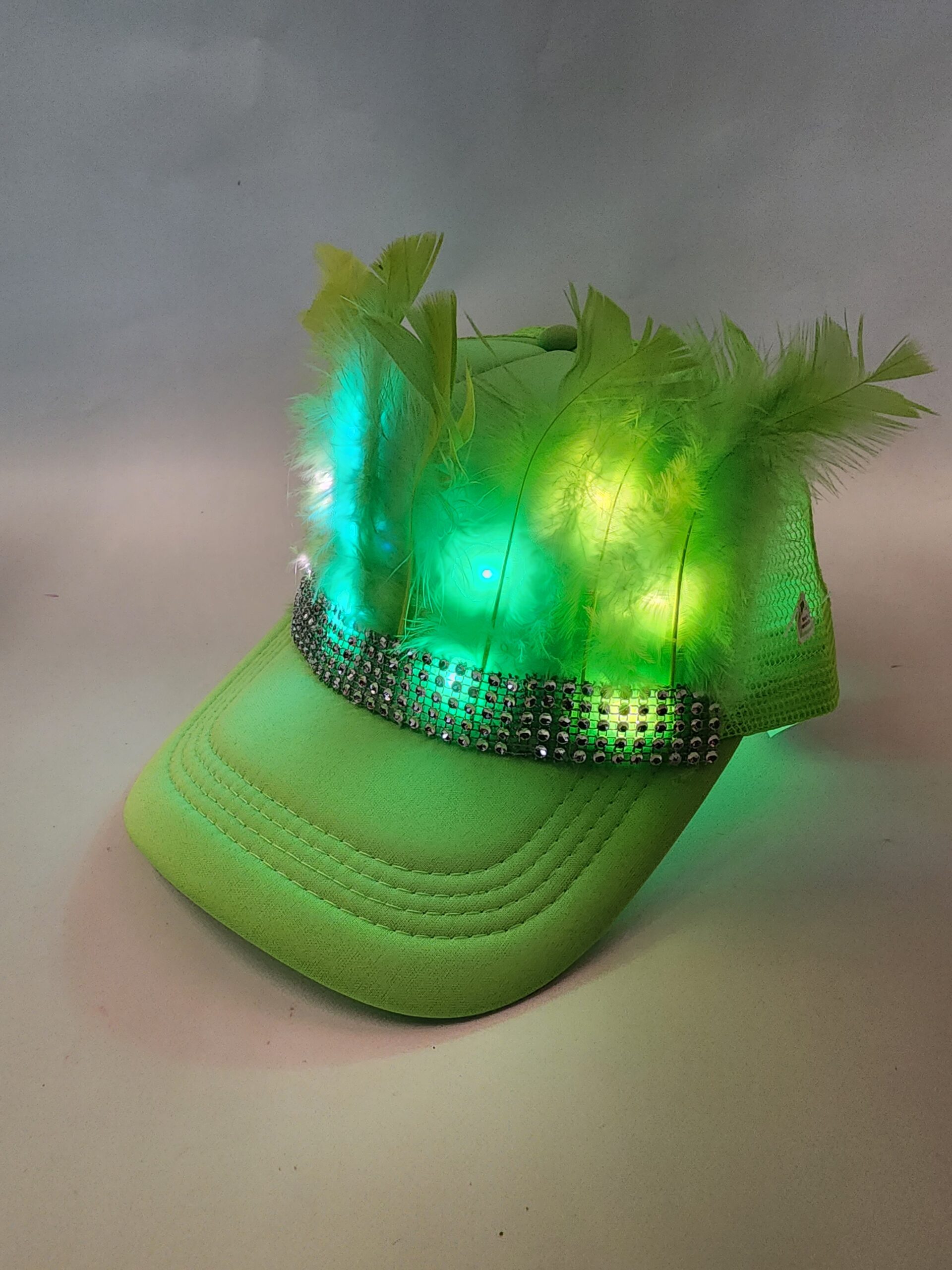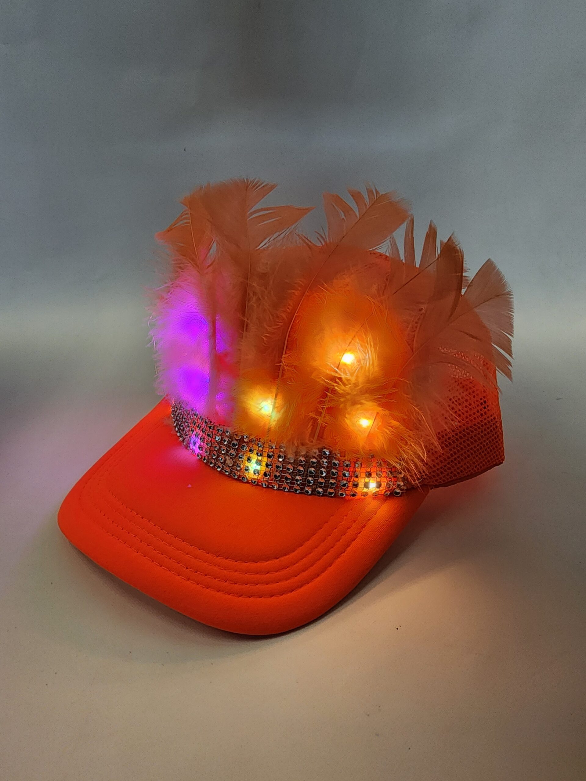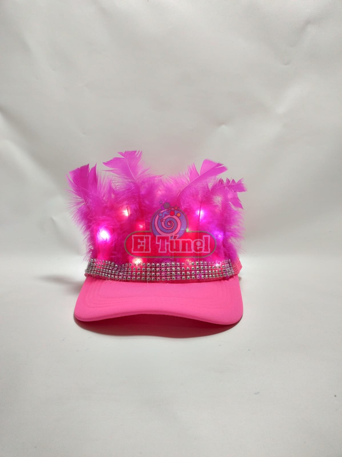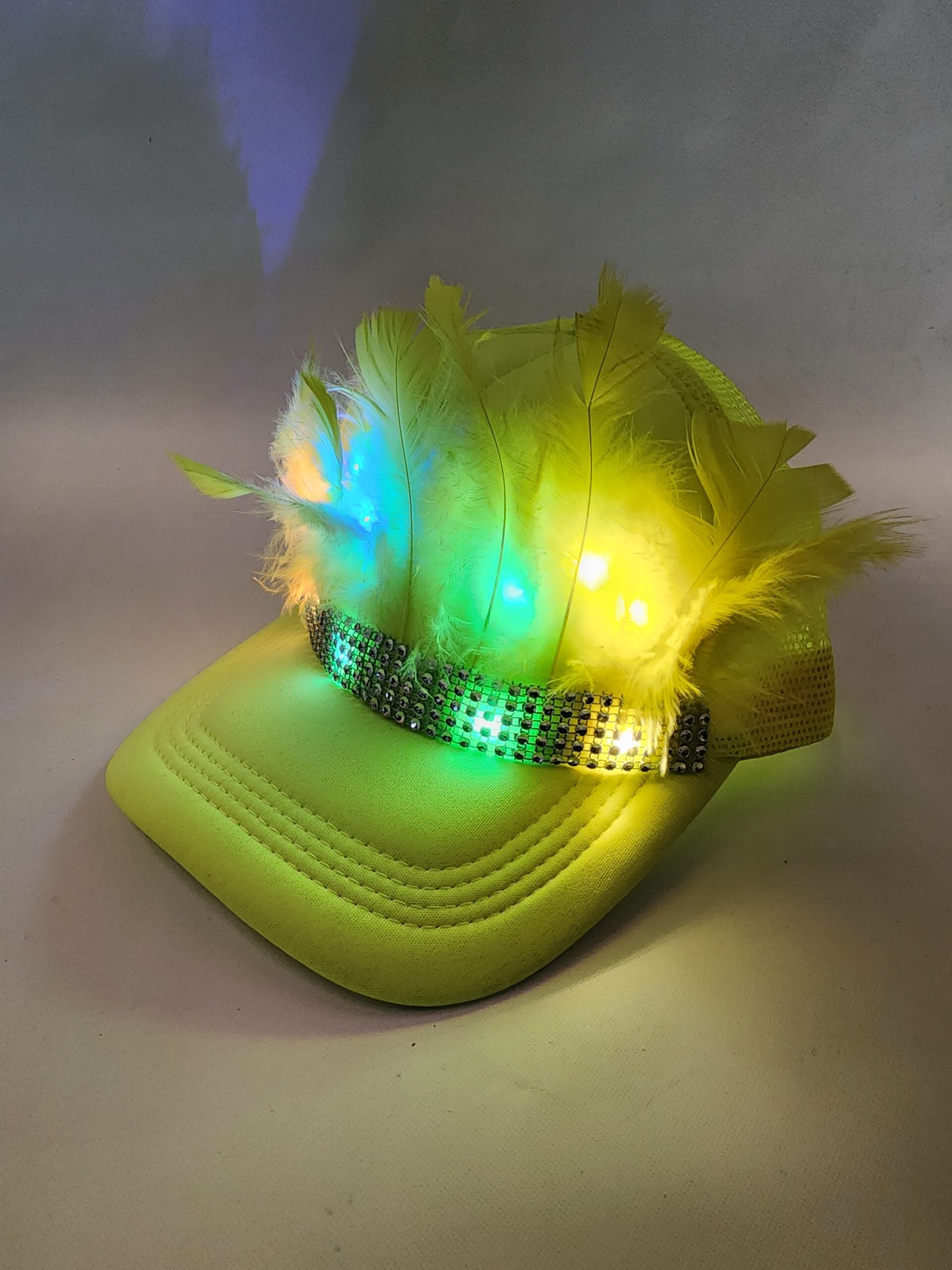 gorra con plumas led, gorra led, gorra luminosa.